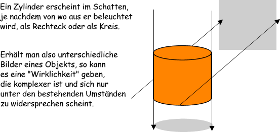 Der beobachtete Sachverhalt kann durch ein Modell nicht in seiner Gesamtheit erfasst werden. Dies wird in der Zeichnung durch eine "Projektion" angedeutet: Es findet ein Verlust an Information statt, das "Bild" des Sachverhalts ist nur noch zweidimensional.