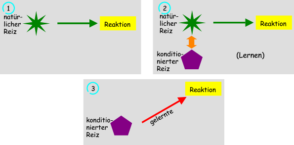 Daraus leitete er das folgende "Lernmodell" ab (Reiz-Reaktions-Lernen oder klassisches Konditionieren).