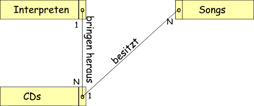 Wir brauchen sowohl für die CD einen "Foreign-Key" , der den Interpreten speichert, als auch bei den Songs einen "Foreign-Key", der die zugehörige CD speichert. Das ganze schaut dann etwa so aus: