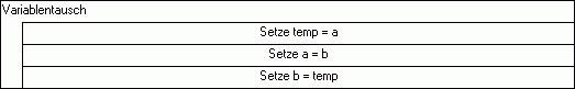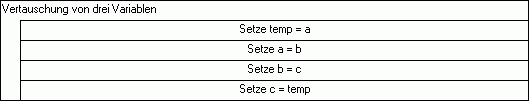 Diese Idee funktioniert nicht, denn nach der Zuweisung von b an a enthalten beide den Inhalt von b und der Inhalt der Variablen a ist verlorengegangen. Deshalb braucht man eine dritte (temporäre) Variable, die als Zwischenspeicher dient: