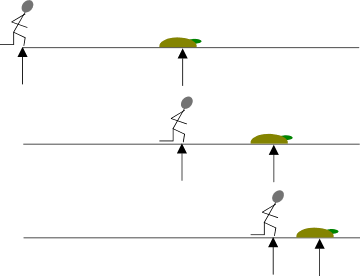 Man kann behaupten, dass Achilles die Schildkröte niemals einholen kann, denn immer wenn Achilles dort ankommt, wo er die Schildkröte gesehen hat, dann ist sie schon zu einer neuen Position weitergelaufen. Dieser Vorgang wiederholt sich unendlich oft.