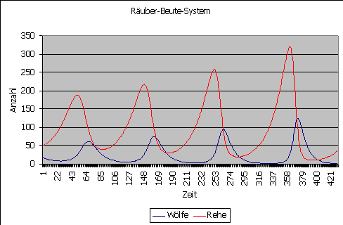Die Rehe wiederum würden sich mit 5% pro Zeitintervall vermehren, werden aber dadurch dezimiert, dass sie auf Wölfe treffen.