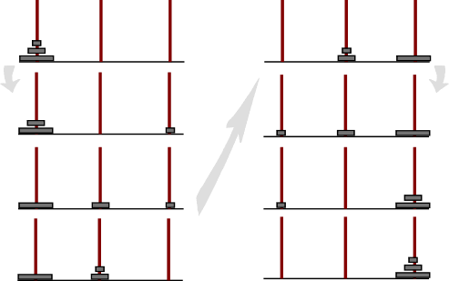 Ein klassisches Beispiel für rekursive Lösung ist das Spiel "Die Türme von Hanoi". Dabei handelt es sich um drei Stangen, auf die Scheiben mit unterschiedlichem Durchmesser aufgesteckt werden können. Die einzige Bedingung ist, dass niemals eine Scheibe mit größerem Durchmesser auf einer mit kleinerem Durchmesser zu liegen kommt. Nun soll so ein "Turm" von Stange 1 nach Stange 3 verschoben werden.