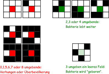 Die folgende Simulation mit zellularen Automaten kam in den 80er Jahren auf: Auf einer virtuellen Gitterebene leben "virtuelle Bakterien" nach einfachen Gesetzen. Das Wachstum hängt entscheidend von den umgebenden Zellen ab. Befinden sich rings um eine existierende "Bakterie" zwischen zwei und vier weitere, so bleibt sie am Leben ansonsten "verhungert" sie oder sie stirbt an Überbevölkerung. Befinden sich rings um eine freie Zelle drei Bakterien, so wird dort eine neue Zelle geboren.