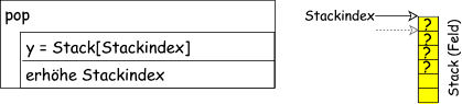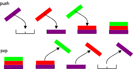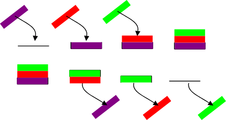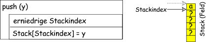 Am Anfang ist der Stapel leer. Werden nun Daten in den Stapel gelegt, so kommen sie "übereinander" zu liegen, d.h. erreichbar ist immer nur das Element, das als letztes "abgelegt" wurde. Um andere Elemente zu erreichen müssen zuerst die "darüberliegenden" entfernt werden.