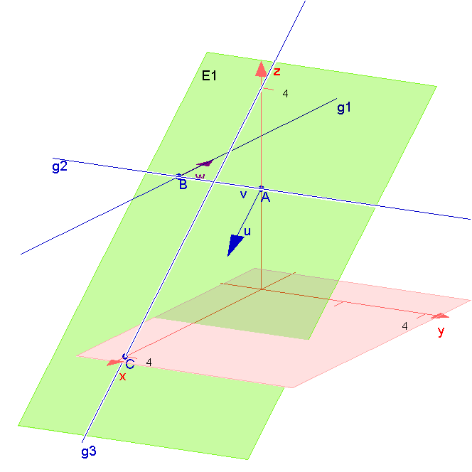• `A(0|0|2); B(0|-2|2); C(0|2|0); vec u = ((-1),(0),(1)); vec v = ((0),(-1),(0)); vec w = ((-1),(0),(0));`