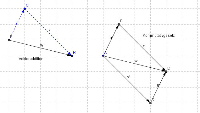 | `vec(PQ)+vec(QR) = vec(PR)` oder vom Fuß des ersten zur Spitze des zweiten |