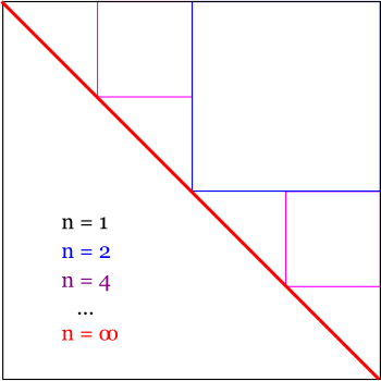 Nähert man sich der Diagonale eines Quadrates durch eine regelmäßige Treppe mit Stufenzahl `n` (Länge `d(n)`) an und lässt n größer werden, so ist die Treppenlänge `d(n) = 2` für jedes endliche n. Erst nach dem Übergang `lim_(n->oo) d(n) = sqrt 2` :