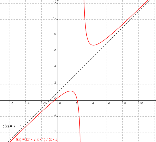 `f(x) = x + 1 + 2/(x-3)` mit wegfallendem Bruch bei großen Zahlen