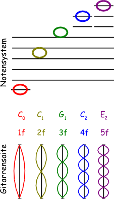 - Eingetragen sind die Schwingungsmoden an einer Saite und die zugehörigen Töne im Tonsystem, basierend auf dem C.