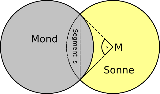 `A_"Segment" = A_"Sektor" - A_"Dreieck"` `A_"Sektor" = 1/4 A_"gesamt"` `A_"Dreieck" = r^2/2` `=> A_"Segment" = 1/4 A_"gesamt" - r^2/2 = 1/4 r^2 pi - r^2/2 = r^2*(pi/4 - 1/2)` `=> A_"bedeckt" = 2*r^2(pi/4 - 1/2) = r^2*(pi/2 - 1) = r^2*(1.57-1)` `A_"gesamt" = r^2*pi = r^2*3.14` `A_"bedeckt"/A_"gesamt" = (r^2*0.57)/(r^2*3.14) = 0.57/3.14 = 0.18` 18% der Sonnenfläche sind in dieser Situation bedeckt. |