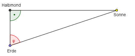 Zeichne die Stellung von Erde, Sonne und Mond in einem Dreieck auf. Welcher Winkel befindet sich in diesem Dreieck beim Mond, wenn es sich um Halbmond handelt?