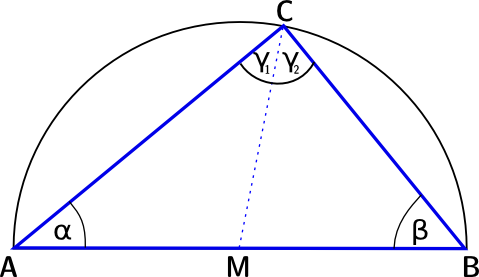 Rechtes Teildreieck gleichschenklig: `r=bar(MB)=bar(MC) => beta = gamma_2` Winkelsumme im Dreieck: `alpha + beta + gamma_1 + gamma_2 = 180°` `alpha + beta + alpha + beta = 180°` `2 (alpha + beta) = 180°` `=> alpha + beta = 90°` Winkelsumme: `gamma = 180°-(alpha + beta) = 90°` `sqrt`