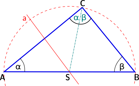 a soll die Symmetrieachse der Strecke [AC] sein. S ist der Schittpunkt aus a und [AB]. S ist also von A und C gleichweit entfernt: `bar(SA) = bar(SC)`. Dann ist das Dreieck `Delta ASC` gleichschenklig. Also ist der Winkel dieses Teildreieckes bei C wieder `alpha`. Wegen `alpha + beta = 90°` muss außerdem der andere Teilwinkel bei C `beta` sein. Also erhält man mit S zwei gleichschenklige Teildreiecke und es gilt: `bar(SA) = bar(SC) = bar(SB)`, also liegen A, B und C auf einem Kreis um S. `sqrt`. |