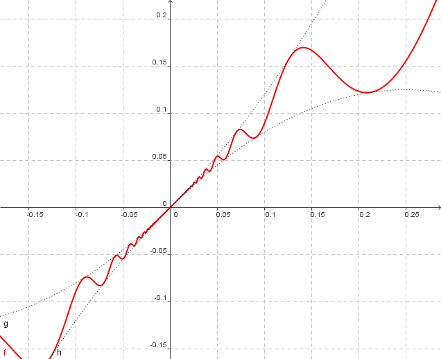 • `f(x) = {(x + 2x^2*sin(1/x), text(für) x!=0),(0, text(für) x=0):}`