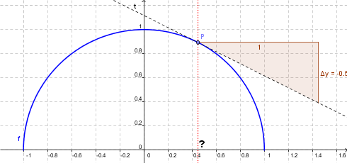 Gesucht ist die Ableitungsfunktion der „Kuppelfunktion“. Die Kuppel kann durch einen Halbkreis beschrieben werden: Nach Pythagoras gilt für jeden Punkt der Funktion:`x^2+y^2=1` Auflösen nach y ergibt`y = k(x) = sqrt(1 - x^2)` mit der Definitionsmenge: `D_f = [-1;+1]`