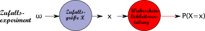 Insgesamt wird also jedem `omega in Omega` ein `x in RR` zugeordnet und diesem `x` wird wiederum ein `P(X=x)` zugeordnet: