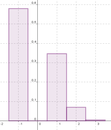 `E(x) = (-1)*125/216 + 1*75/216 + 2*15/216 + 3*1/216 = -17/216 ~~ -0,08`