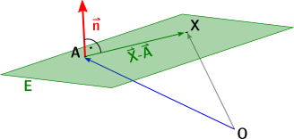 $X$: Beliebiger Ebenenpunkt $A$: Aufpunkt (ein bekannter Ebenenpunkt) Der Normalenvektor steht auf jedem Verbindungsvektor zwischen einem Ebenenpunkt und A senkrecht. |