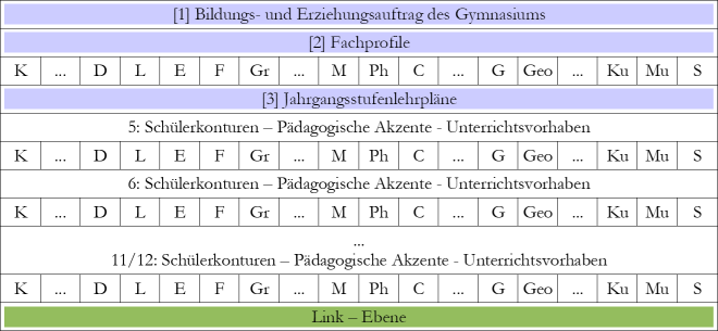 - Angaben zu Gewichtung und Reihenfolge der Inhalte haben Vorschlagscharakter und können nach pädagogischem und didaktischem Ermessen geändert werden; Rücksprache innerhalb der Fachschaft ist empfehlenswert