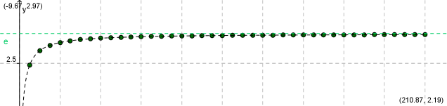 `(e^x)' = e^x` für kleine h gilt: `(e^h-1)/h~~1 => e^h-1~~h => e ~~ (h+1)^(1/h)` Je kleiner man h wählt, desto exakter wird die Annäherung. Zur besseren Vorstellung kann man `h` auch mit `1/n` substituieren: