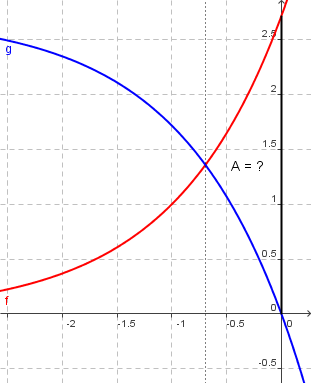 `f(x) = g(x) => f(x) - g(x) = 0` `e^(x+1) - (e - e^(x+1)) = 0` `2*e^(x+1) - e = 0` `2*e^(x+1) = e` | ln() `ln(2*e^(x+1) = ln (e^1)` `ln(2) + ln(e^(x+1)) = 1` `ln(2) + x + 1 = 1` `ln(2) + x = 0 => x = - ln(2)` Flächeninhalt zwischen den Graphen im Intervall von -ln(2) bis 0: `int_(-ln(2))^0 2*e^(x+1) - e dx = [2*e^(x+1) - e*x]_(-ln(2))^0` `= 0.83` |