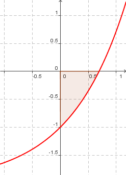 `f(0) = -2 => S_Y(0|-2)` `f(x) = 0 = e^x - 2 => x = ln(2) => S_X(ln(2)|0)` Berechnung des Flächeninhaltes: `int_0^(ln(2)) e^x-2 dx = [e^x - 2x]_0^(ln(2)) = e^(ln(2)) - 2*ln(2) - (1-0)` `= 2 - 2*ln(2) - 1= 1 - 2*ln(2) = -0.39` Es ergibt sich ein Flächeninhalt von 0.39.
