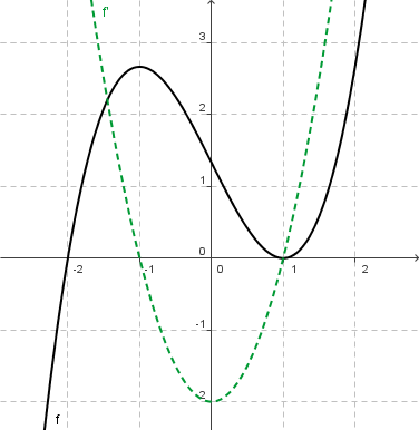 - Die Hoch- und Tiefpunkte von f(x) sind die Nullstellen von f'(x), also besitzt f'(x) Nullstellen bei `x_text(1/2) = +-1`. Am steilsten ist der Graph von f bei x=0, hier muss f'(x) einen Tiefpunkt haben.
