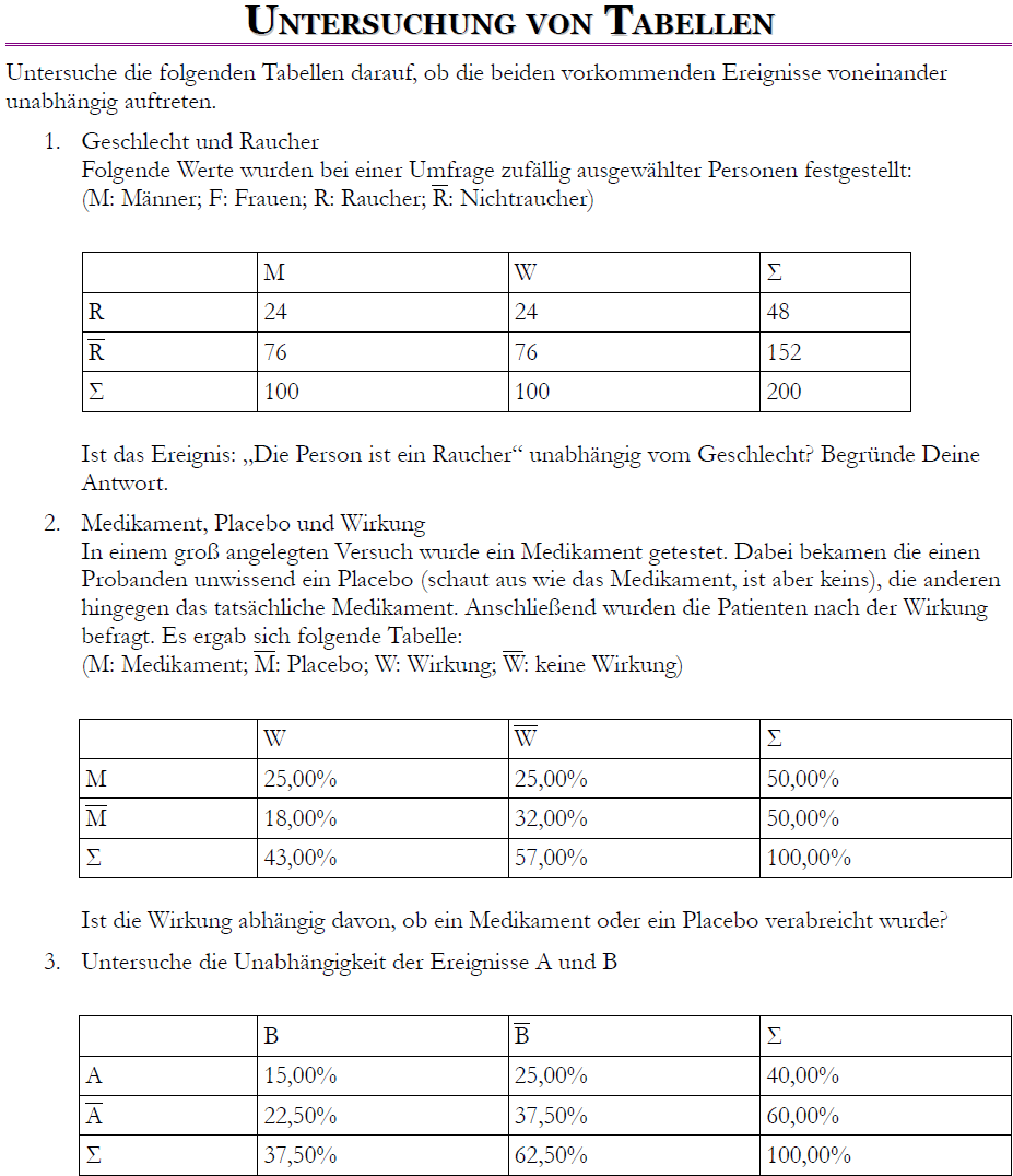 Arbeitsblatt zur Einführung der Unabhängigkeit von Ereignissen