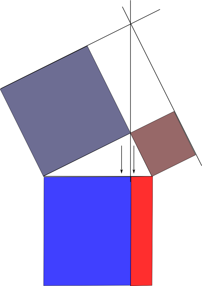 Dieser Beweis des Satzes von Pythagoras zeigt außerdem die Gleichheit von `a^2` mit `p*c` und `b^2` mit `q*c`, ist also zugleich ein Beweis für den Kathetensatz.