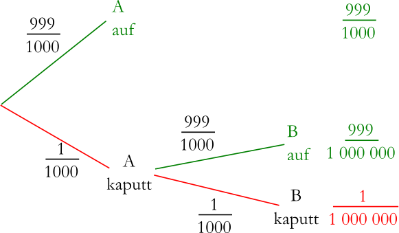 ` P(bar F) = 1/1000 `. Ein Fallschirmspringer springt normalerweise mit zwei Schirmen ab. Wie groß ist die Wahrscheinlichkeit, dass sich keiner von beiden Schirmen öffnet?