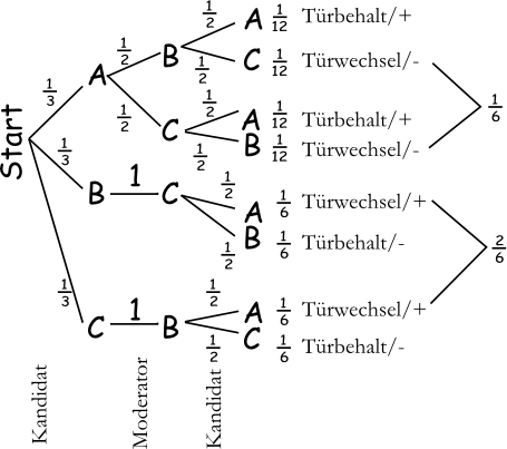 Bei Durchwanderung jedes Pfades erhält man alle Möglichkeiten, die sich ergeben, wenn sich das Auto hinter A befindet. Die Wahrscheinlichkeit für die entsprechende Wahl ergibt sich aus dem Produkt der einzelnen Pfadwahrscheinlichkeiten.
