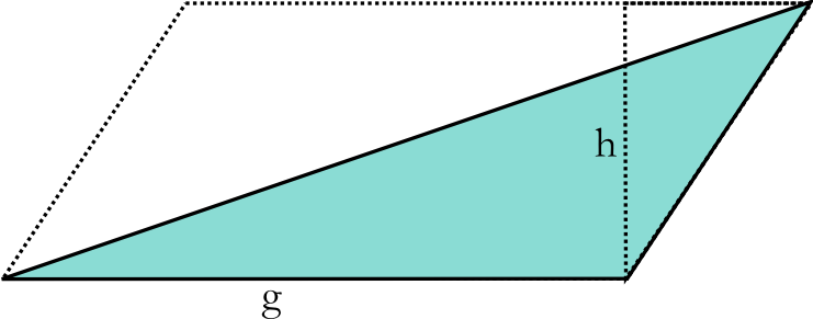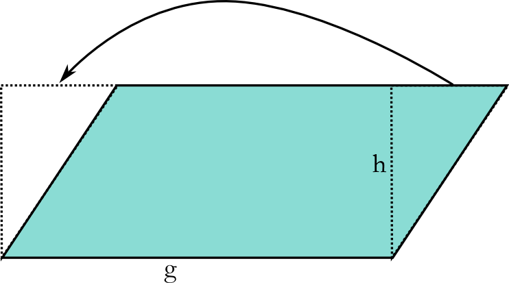 Durch Abschneiden und Anfügen eines geeigneten Dreiecks lässt sich der Flächeninhalt eines Parallelogramms in den eines Rechtecks überführen. Es gilt: